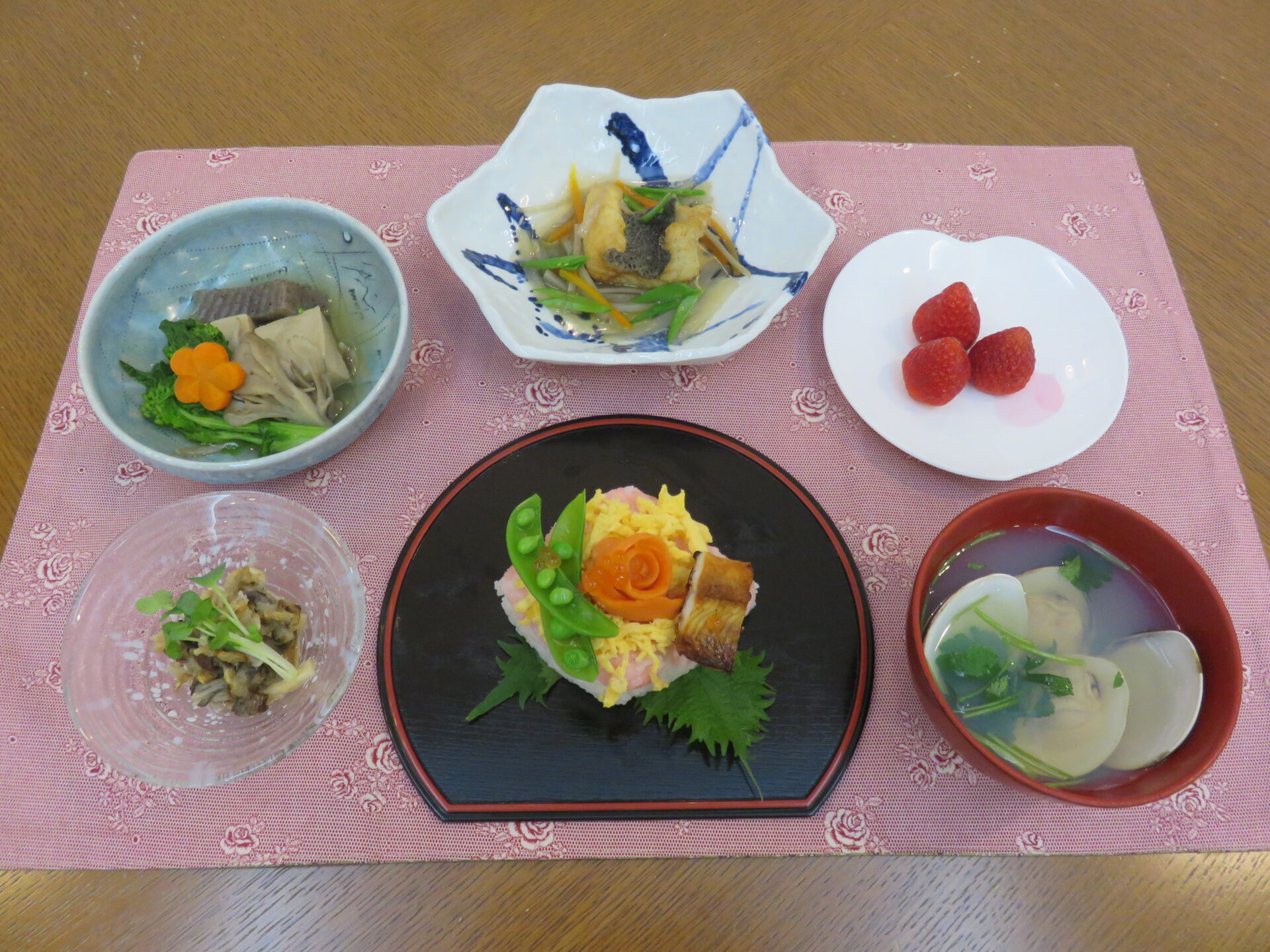当院では昼食に、春の旬菜をふんだんに盛り込んだひな祭りのお食事をお出ししました。