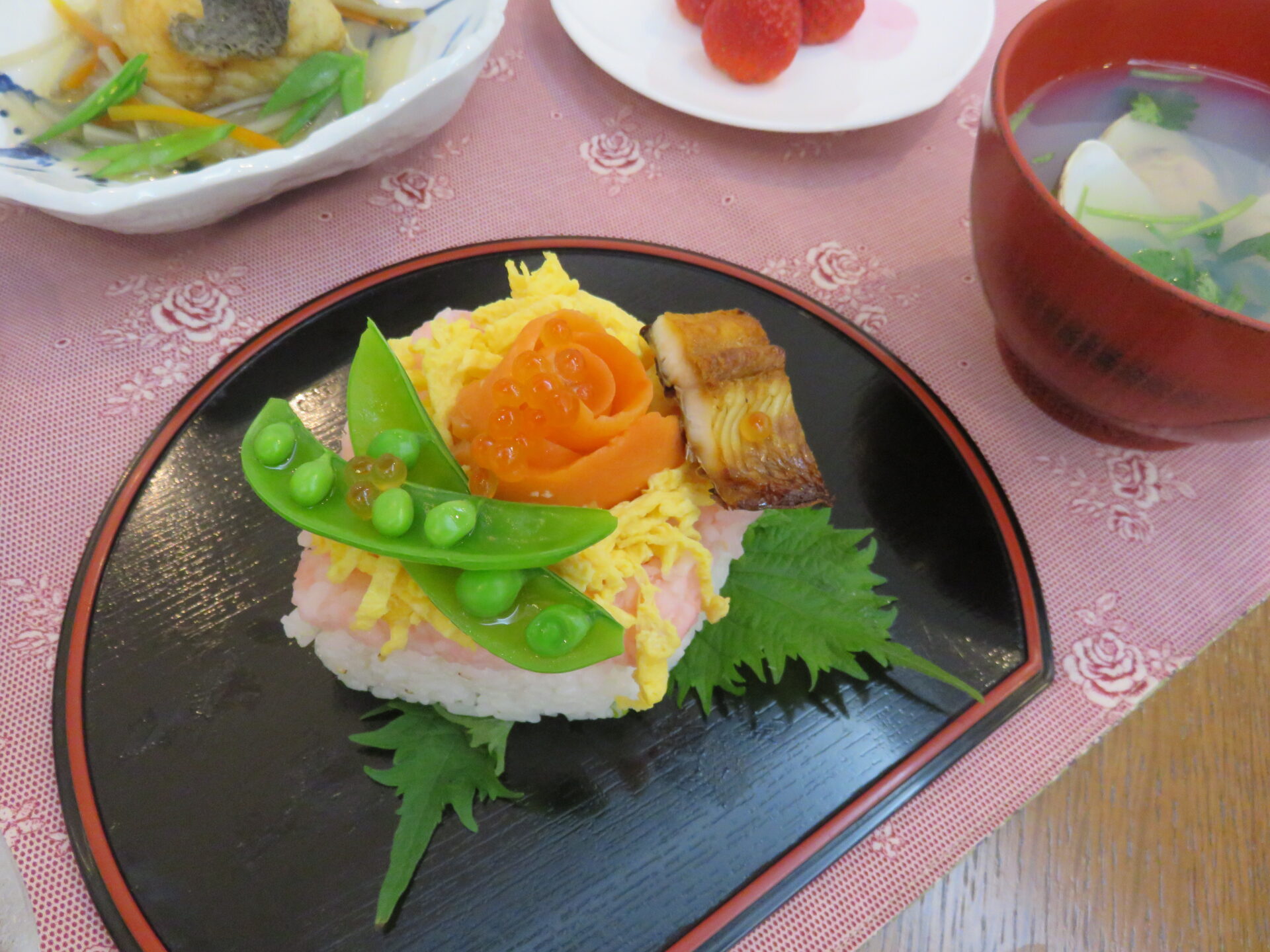 幸せが広がるように願いを込めたちらし寿司、良縁の象徴であるはまぐりの潮汁、そして色とりどりのひなあられもお付けしました。